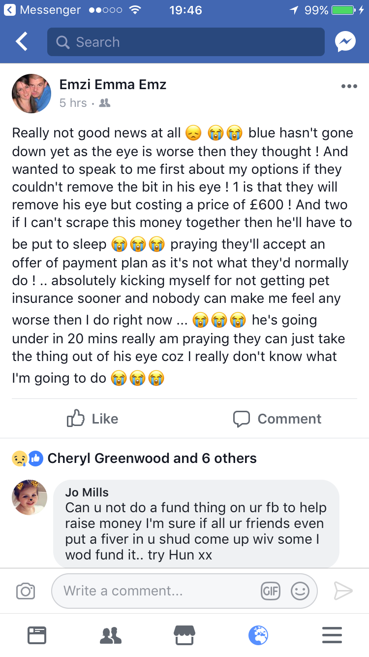 Emma needs help with vet bills and also to help towards and already outdoor space to keep blue safe in future, and to set up pet insurance for at least a year too...