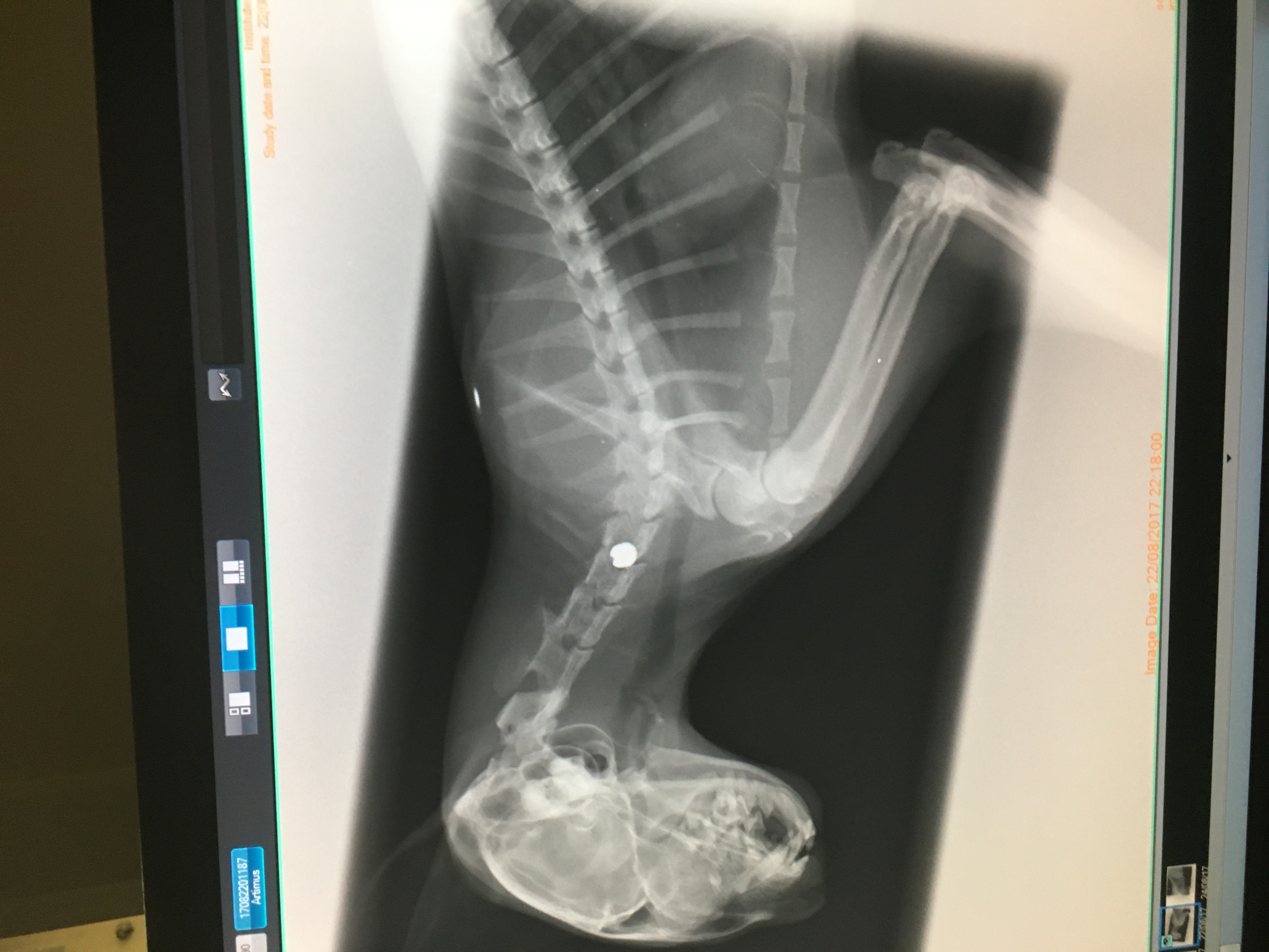 Just a bit of an update for everyone. Artie has had his surgery, when they took the pellet out they found that it had punctured his wind pipe. Fortunately they have successfully removed it now and stitched him up. He's having trouble breathing at the moment. However he is able to move all of his limbs a bit now which is good. The vets think he will make a full recovery providing there are no further complications. He is staying at the vets for another 2 weeks minimum to heal. Thanks for everyone's support. From Cyrus and Georgia Mason