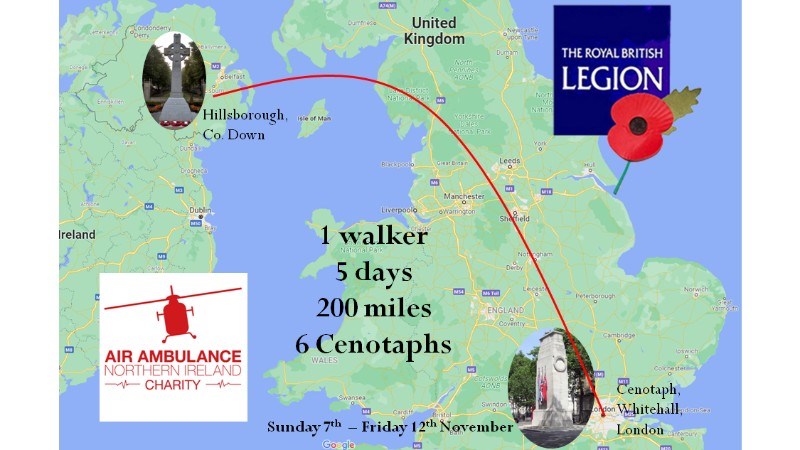 I'm walking from Hillsborough, Co. Down to the Cenotaph at Whitehall to raise funds for the the Air Ambulance NI and Royal British Legion.