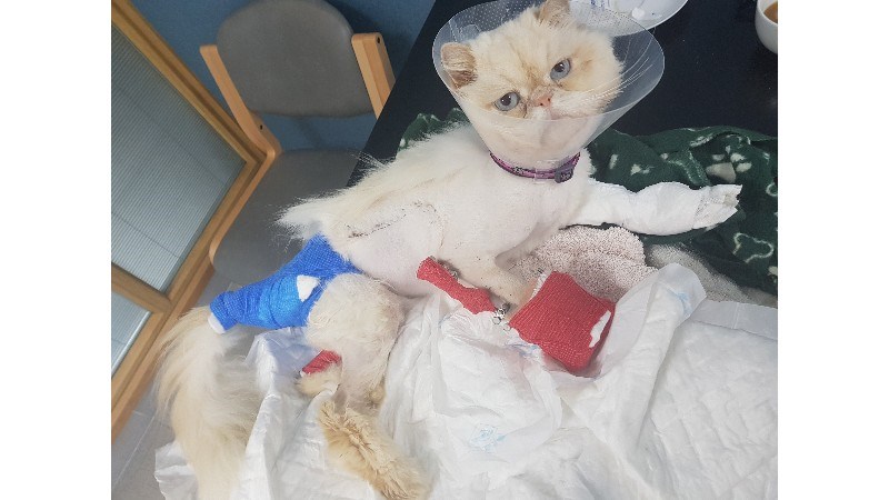 Devastatingly Simba was ran over on 9th October 2017. His front left leg totally degloved and with a broken ulnar. His left with multiple fractures and serious damage to his toes. He has had numerous operations to rebuild his legs and skin grafts. All the time purring away and never ever being in bad spirits. Kian and I have made the 250mile round trip nearly every day so they can be together. Simba visibly lifting in spirit and heart when they are reunited. Kian often falling asleep with him on the vets table and cuddling up to him.