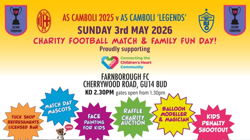 On Sunday 3rd May 2026, the AS Camboli football team will once again compete against AS Camboli ‘Legends’ from the past. A wonderful event hosted by our great friends at Farnborough FC has raised over £40,000 for good causes over the past few years!