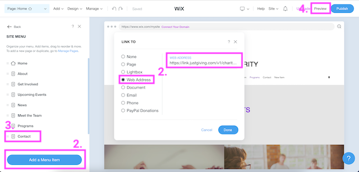 Log in to your charity’s Wix website and navigate to your website. Go to the page where your existing Donate button lives, or where you’d like to add a new Donate button using the dropdown in the top left corner.