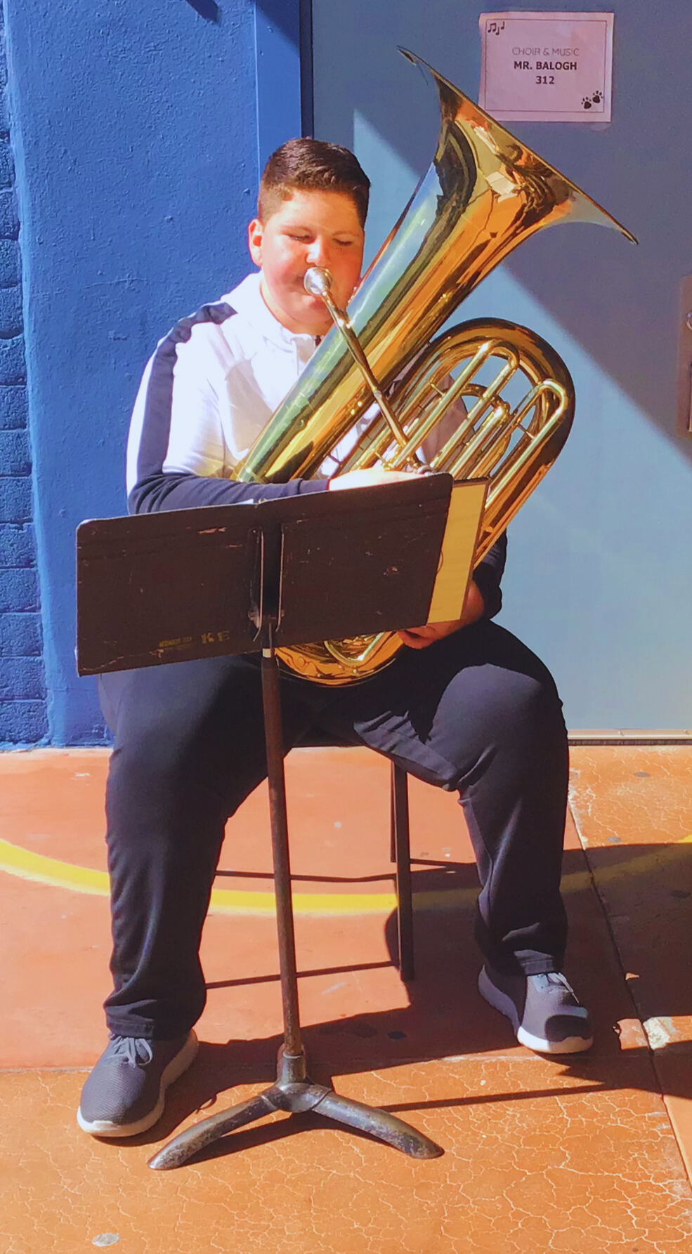 All those aged instruments keep the repair shop busy. But when their instruments are out, students have to share the ones that work—especially the eight tuba players who are always short because one or two of their instruments are always out of commission at any given time. But that doesn’t daunt these students! One tuba player, Isabella, comes to class full of smiles, says Mr. Blough, undeterred by daily struggles with her case that is falling apart and held together by zip ties, and an aged instrument that is so beat up, she has to ask Mr. Balogh every day to help her release the slide.