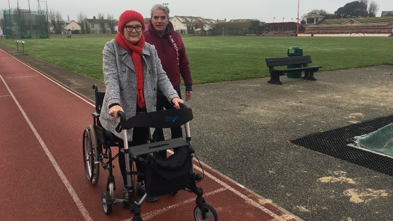 Her challenge is taking place at the F.B. Fields athletics track using her walking frame( Monday to Saturday, weather permitting and indoors at Springfield Leisure Centre if needed) .This is all the more amazing as she has suffered from Pontine Demyelination, a brain injury which strips the protective sheath away from the nerves of the brain stem, since 2008 and at the time was told she might not walk again.