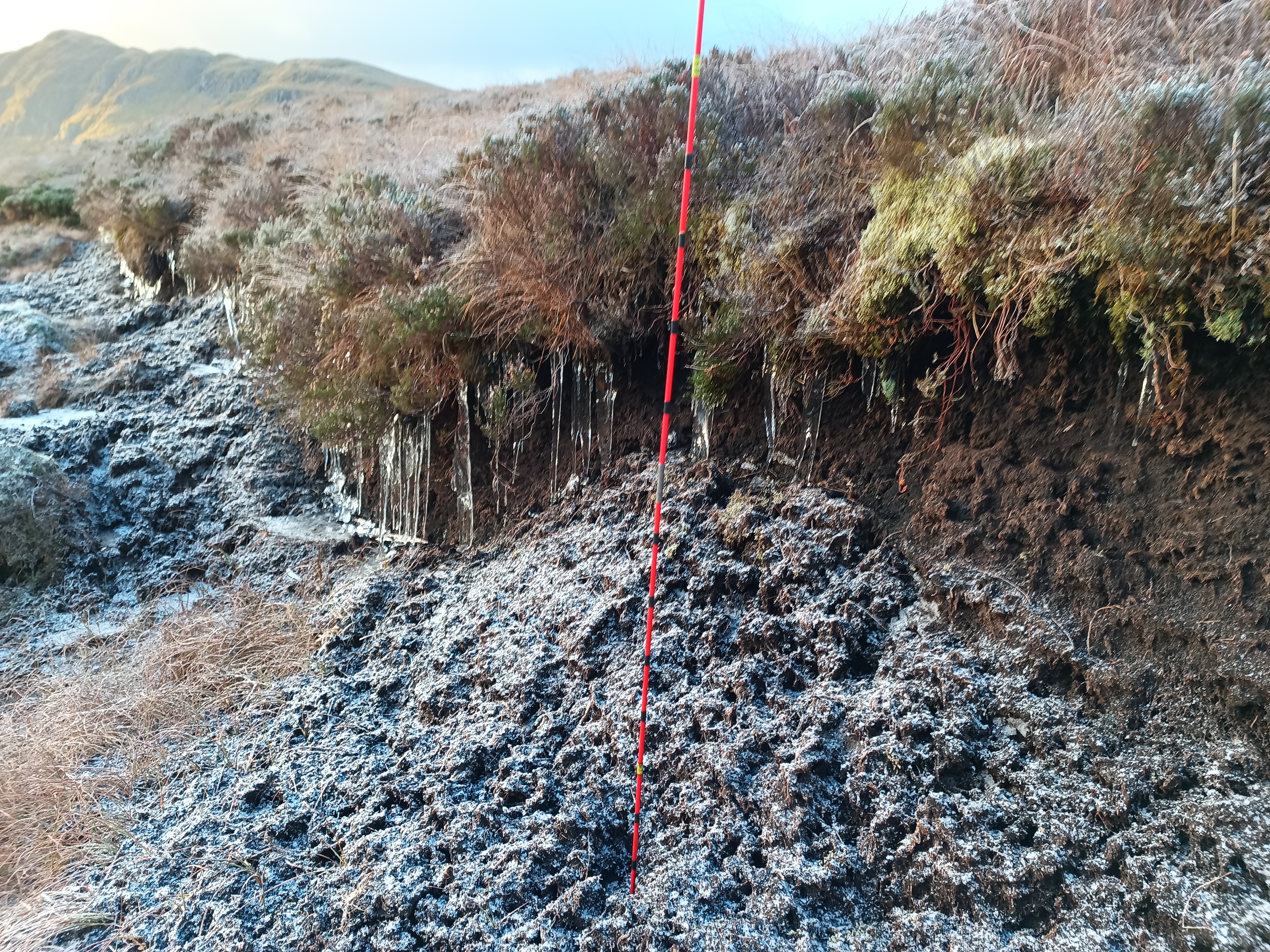 Erosion gullies have carved through the peatland on the slopes of Meall Corranaich. These gullies act like small rivers, speeding up water flow and worsening the erosion. Other bare peat occurs in the form of peat hags.