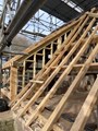 A major step forward has been the repair of the wonderful timber roof over the Bridge House, completed at the beginning of 2025. The 400 year old oak trusses were extensively decayed, but after nearly a year's work have now been completely repaired. Specialist heritage contractors using traditional carpentry skills restored the original frames by 'scarfing in' new oak to give them a new lease of life. They also reinstated a section of elevated or 'catslide' roofing at the end of the building which had been added when it was a paper mill to create space for a small room in the upper level. This was visible in early photographs but had totally disintegrated by the 1980s. Masonry repairs included restoring an arched doorway through the side wall, which had been bricked up when the space was used to house farm animals.