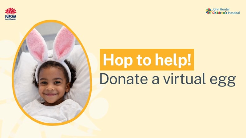Through our Hop to Help campaign, we’re inviting our community to donate a virtual Easter egg to support children receiving care at the John Hunter Children's Hospital this Easter. Every donation helps make a difference for kids and families during their hospital journey.