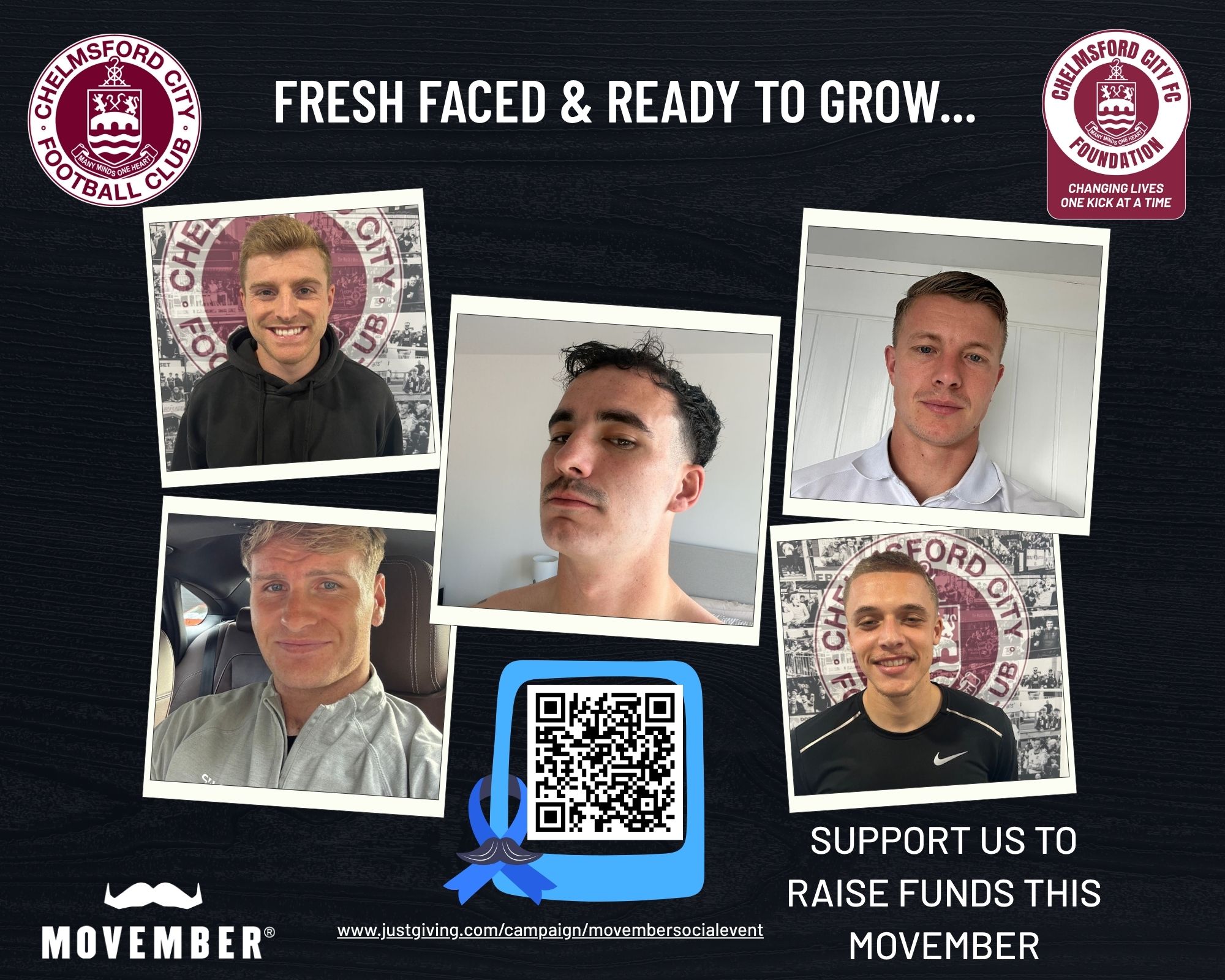 CCFC players Chris Haigh, Joe Grimwood, Archie Tamplin, Jack Barnham, Kian Ronan & Tom Lapslie are all working with Chelmsford City FC Foundation to raise awareness & funds for Movember 2025.