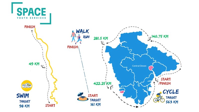 Individually, with friends and as a group we will be swimming 98 km, the length of the River Tamar. cycling 563 km, the circumference of Devon and running or walking 161 km. the distance from North to South Devon. We will be adding our mileage contributions to our progress map!