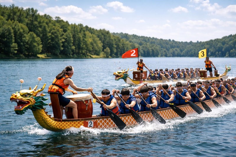 Throughout the day, teams take part in three thrilling heats, with crowds of supporters lining the lakeside to support their favourites. Drums are beating, paddles splashing, and supporters roaring their teams to victory.
