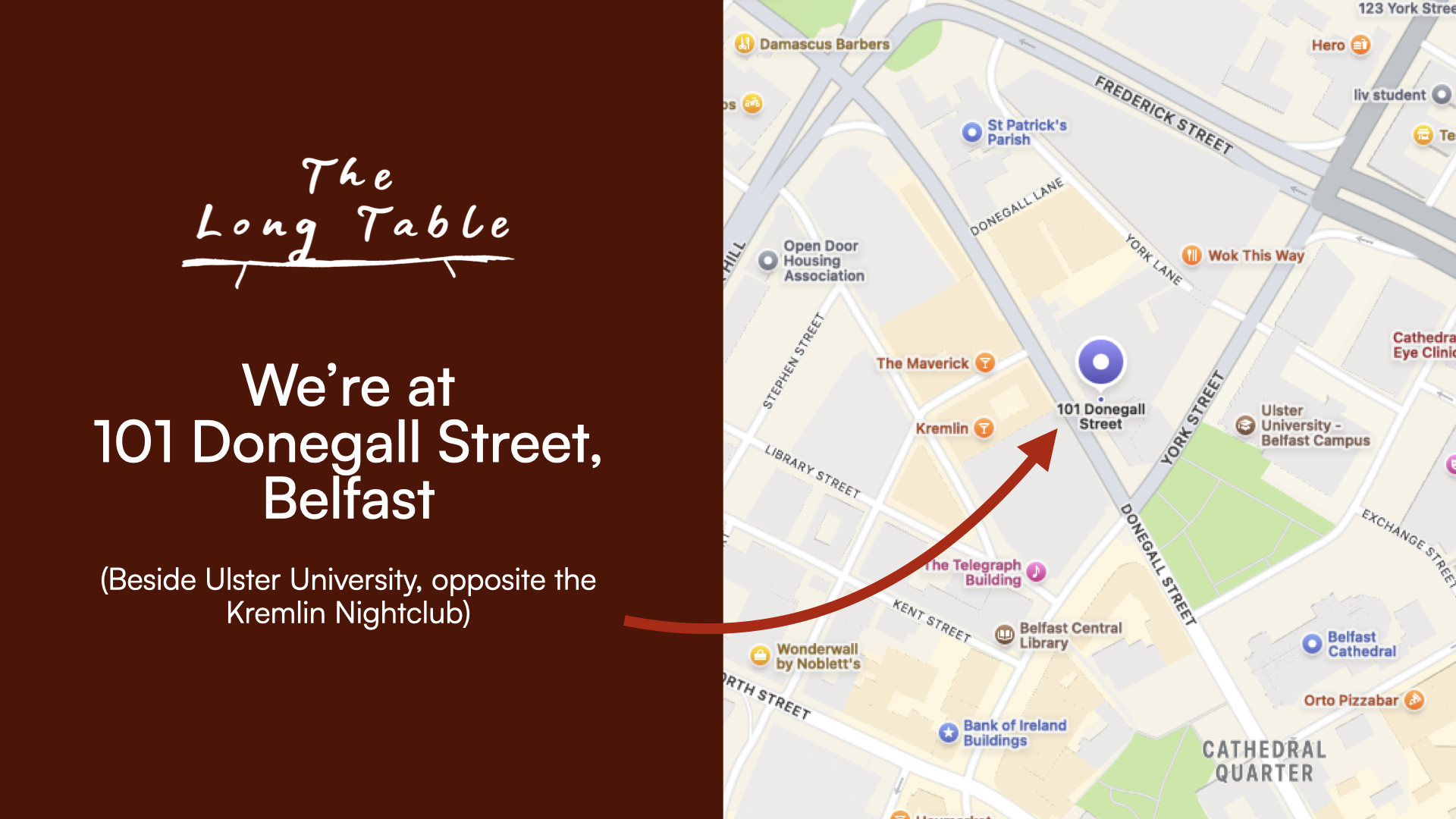You’ll find us in the heart of Belfast’s Cathedral Quarter at 101 Donegall Street (beside Ulster University) every Friday from 6-7pm, serving delicious food to anyone who drops in. Come and join us at the table, there’s a place for everyone! We look forward to seeing you.