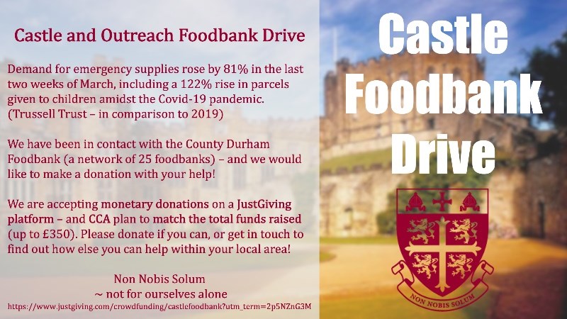 We are raising money using this JustGiving platform, which CCA then plans to match (up to £350) to purchase and deliver food and emergency items required by the Durham Foodbanks - which they will then distribute to those in need. Please donate if you can, or get in touch to find out more information and how you can help within your local area.