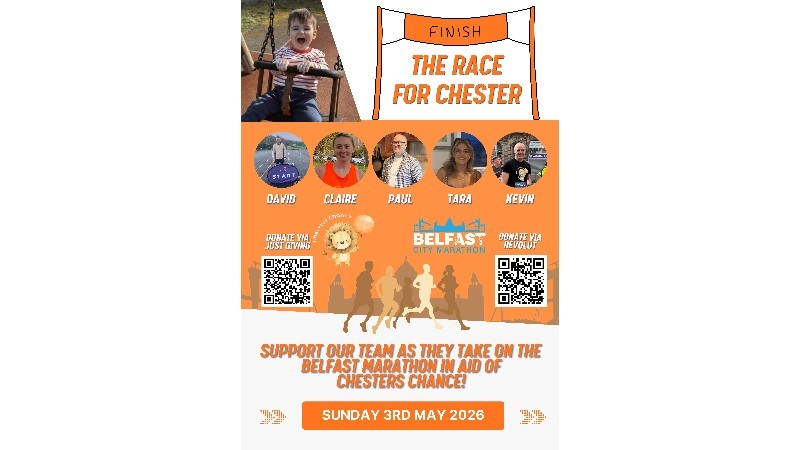 We’re taking on the Belfast City Marathon on Sunday 3rd May 2026, with David, Claire, Tara, Paul and Kevin lacing up their runners to raise vital funds for Chester’s Chance, in loving memory of Chester Byrne.