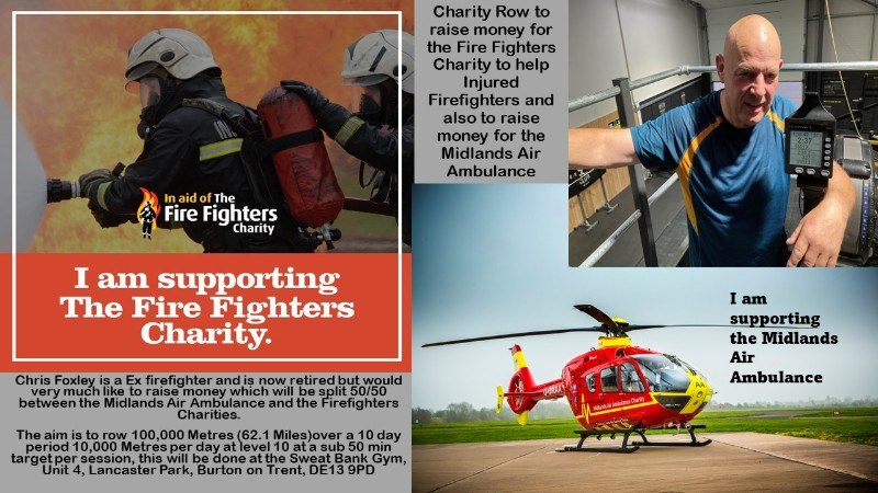 Chris Foxley is an Ex-Firefighter/Crew Manager who worked for Staffordshire Fire & Rescue Service and has seen how important the Fire Fighters Charity is to injured and mentally scared Firefighters when they need help and or rehabilitation. Also the extremely valuable lifesaving work that the Midlands Air Ambulance service do, especially when assisting at scenes of Road Traffic collisions. Chris left the Fire service 18 months ago at 65 years of age and since then has joined the Sweat Bank Gym at Lancaster Park, Burton on Trent to improve and maintain his fitness level. And as such has set himself this challenge, to complete 100,000 metres (62.1 miles) over a 10-day period completing 10,000 metres per day at level 10 on the rowing machine with the aim of completing each session at sub 50 mins. It is a challenge says Chris at a young 67 years of age, and do I feel out of my comfort zone? Hell yes! But at times you do in the Fire Service, but that's how we like it, Chris would very much like your support in raising money for this very valuable cause. (Here we go")