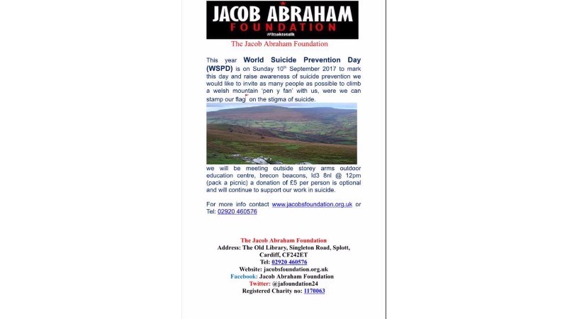 Sunday10th September is World Suicide Prevention Day. Joanne and Graham will be supporting the Jacob Abraham Foundation in marking this day with a walk up to the top of Pen Y Fan. We are asking all our friends and family to dig deep in sponsoring us, any donation big or small is welcome.