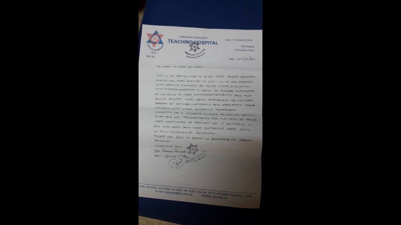 i would like to request you all from the very bottom of my heart to help the undergoing treatment of encephalitic patient at ICU of Teaching Hospital Since 2074/4/2017(As per nepali calendar).your small help would make a huge difference to save someone's life.