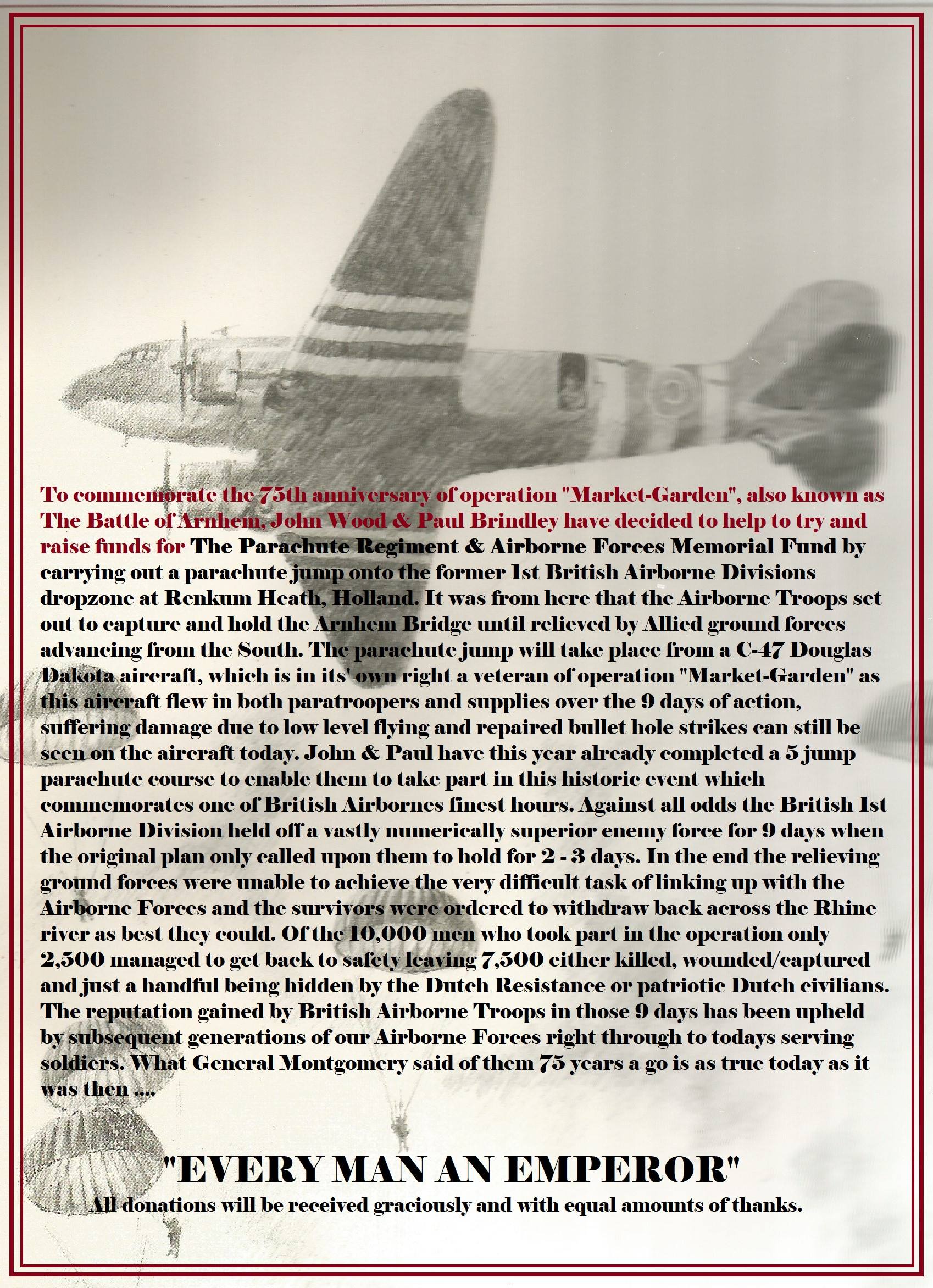 To Commemorate the 75th anniversary of operation "Market-Garden", also known as The Battle of Arnhem, John Wood & Paul Brindley have decided to help to try and raise funds for The Parachute Regiment & Airborne Forces Memorial Fund by carrying out a parachute jump onto the former 1st British Airborne Divisions dropzone at Renkum Heath, Holland. It was from here than the Airborne Troops set out to capture and hold the Arnhem Bridge until relived by Allied ground forces advancing from the South. The parachute jump will take place from a C-47 Douglas Dakota aircraft, which is in it's own right a veteran of operation "Market-Garden" as the aircraft flew in both paratroopers and supplies over the 9 days of action, suffering damage due to low level flying and repaired bullet hole strikes can still be seen on the aircraft today. John and Paul have this year already completed a 5 jump parachute course to enable them to take part in this historic even which commemorates of of British Airbornes finest hours. Against all odds the British 1st Airborne Division held off a vastly numerically superior enemy force for 9 days when the original plan only called upon them to hold 2-3 days. In the end the relieving ground forces were unable to achieve the very difficult task of linking up with the Airborne Forces and the survivors were ordered to withdraw back across the Rhine river as best they could. Of the 10,000 men who took part in the operation only 2,500 managed to get back to safety leaving 7.500 either killed, wounder/captured and just a handful being hidden by the Dutch Resistance or patriotic Dutch civilians. The reputation of the British Airborne Troops in those 9 days has been upheld by subsequent generations of our Airborne Forces right through to today's serving soldiers. What General Montgomery said of them 75 years ago is as true today as it was then...