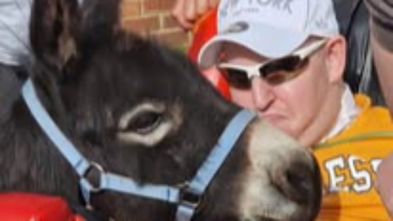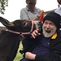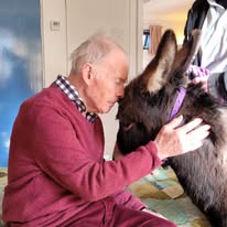I set Minidonks up after losing my mum to dementia back in 2017. I had taken my beautiful miniature donkeys to visit her when her dementia progressed to the point that she needed full time professional care. I saw how much it cheered up all the residents (and staff!) just seeing and stroking and talking to the donkeys. My dad was also living with dementia and this is him, after we lost mum, with little Millie.