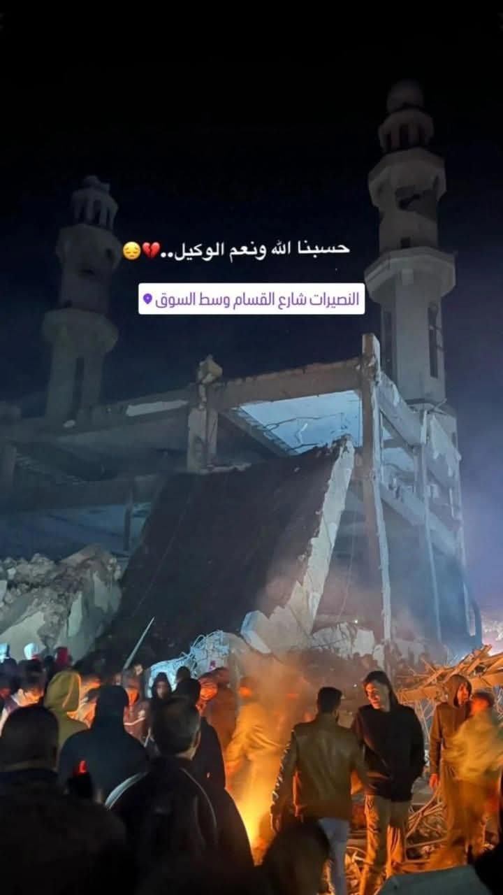 The Martyr Izz al-Din al-Qassam Mosque, located at Al-Souq Street in Al-Nuseirat Refugee Camp, is one of the most prominent mosques in the area, used to attract around 3,000 worshippers. The mosque is distinguished by its diverse religious and educational activities. It hosts more than 45 Quran memorization circles, in addition to a specialized center for teaching Quranic rules and recitation. It also has a Quran memorization center for women and another for children's education, contributing to the spread of knowledge across different segments of society. The mosque's activities are not limited to religious education; it also offers supplemental school lessons for all educational stages, strengthening its role as a vibrant cultural and educational hub in the region.