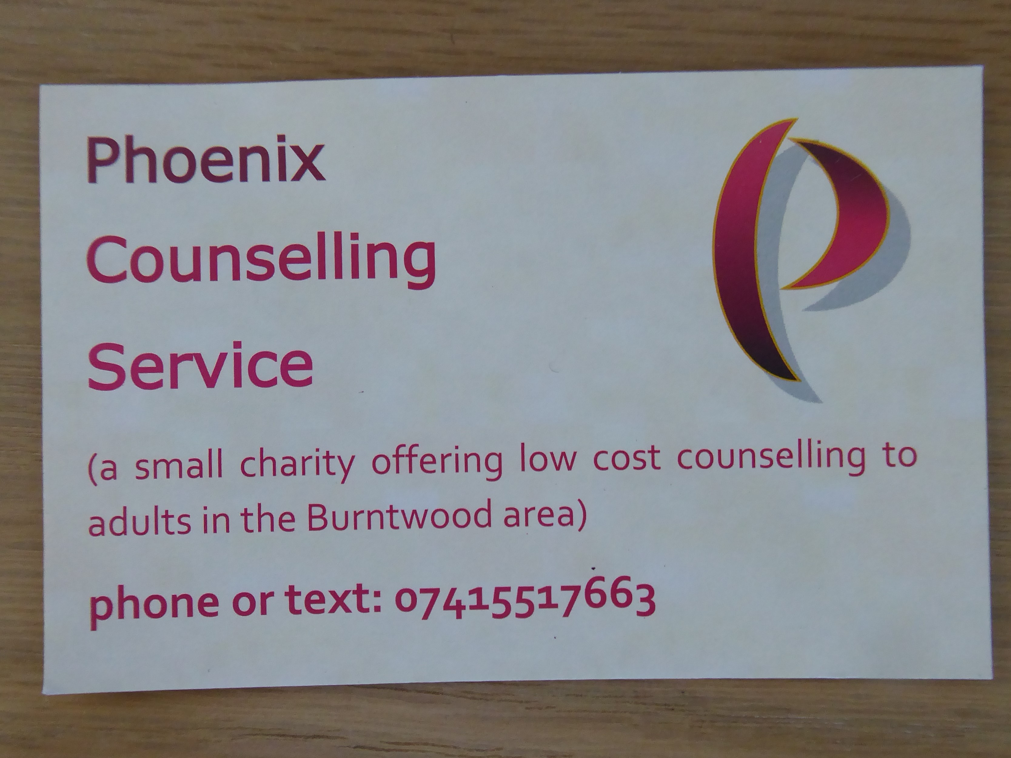 Few people can access counselling via the NHS and many cannot afford private counselling. Phoenix Counselling Service is trying to redress this by providing a high quality professional low-cost counselling service for people In Burntwood, Lichfield and the surrounding areas who cannot access counselling otherwise, so that no one in that area is prevented by finance from having counselling. It is a voluntary organisation and its application to register as a charity is pending. Most of the counselling is done on a voluntary basis with Phoenix only paying for the room hire and professional expenses of volunteers. However there is a lengthy, and increasing, waiting list for appointments and so it is necessary to look towards paying for some counselling hours.