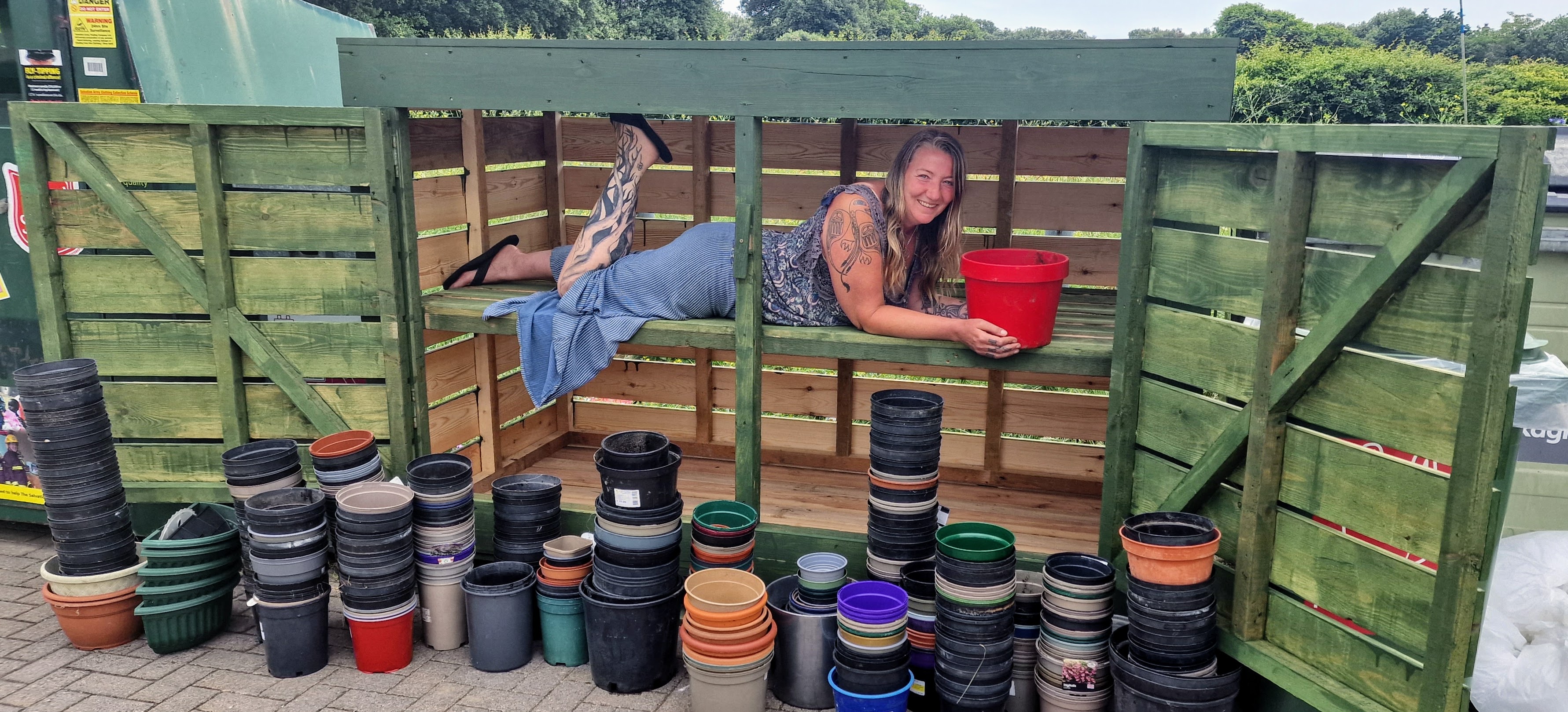 This 2.4m wide x 1.2m deep Plant Pot Reuse Station had just been delivered to the Les Creux Recycling Centre in the Parish of St. Brelade, Jersey. After a just a few days, it was almost full of pots and people were collecting the ones they wanted, posting messages of thanks on FB.