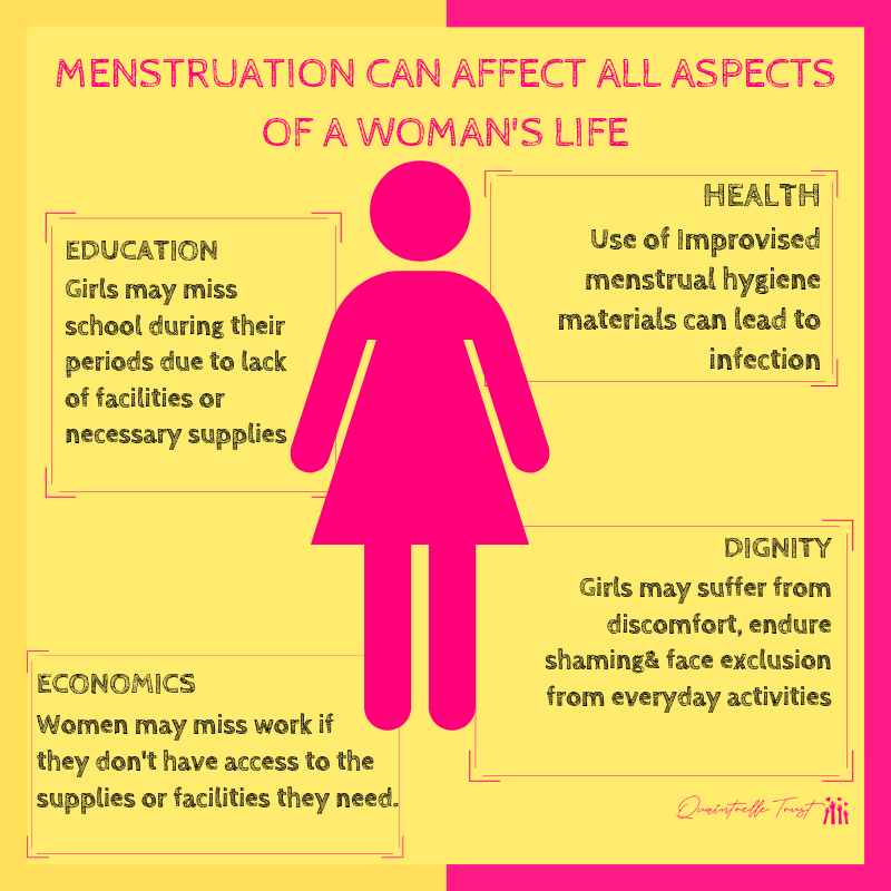In addition to having to live with the damaging taboo that surrounds menstruation, many girls & women struggle every month just to manage their periods hygienically, something that many of us take for granted. Lacking access to basic sanitary & hygiene products or facilities, women are forced to use unhygienic cloths & girls often skip school out of shame/fear of bullying. Lack of basic products or knowledge about how to manage menstruation can lead to both physical and psychological harm, which results in girls missing out on crucial education which affects their confidence & the ability to sustain themselves.