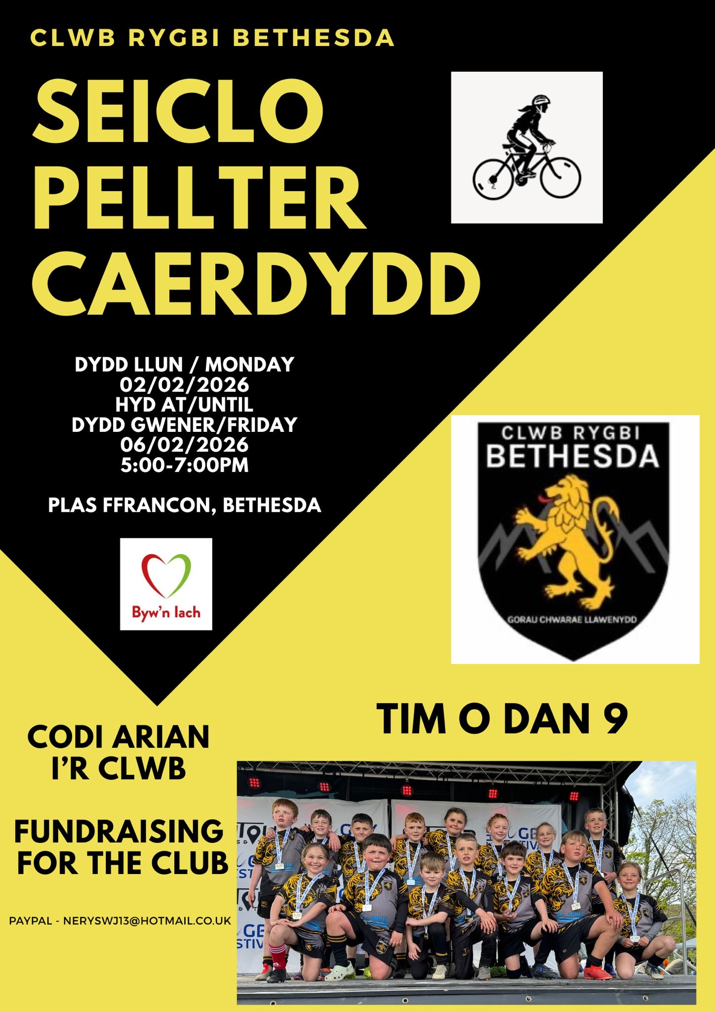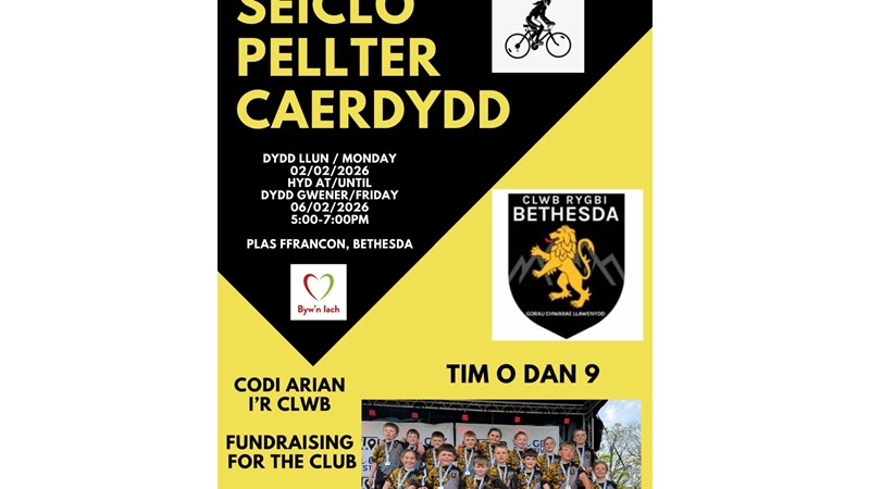 Mae Tîm Rygbi Dan 9 Bethesda yn hel arian i’r Clwb. Bydd y criw yn seclo’r pellter o Fethesda i Gaerdydd ar feiciau gym yng nghanolfam hamdden Plas Ffrancon. Diolch am gefnogi!