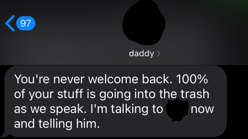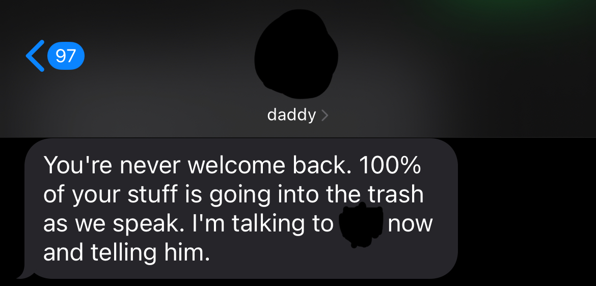 Recently, however, I have been on a trip to stay with some friends and my father decided to finally snap at the idea of me leaving him to care for my sister on his own for a few weeks. He texted me proof of him throwing out all my belongings, saying he sent my dog to the pound, and turned my little sister against me. It is not safe for me to return home even if I wanted to, knowing all of this. As awful as this all this, it is my ONLY chance to escape his house and finally move out on my own.