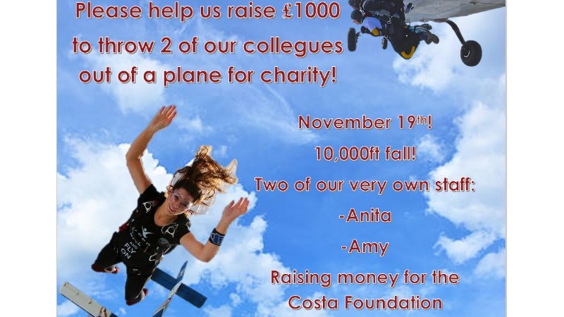 Costa coffee the parade Anita & Amy are going to do a 10,000 ft sky dive November 19th to raise money for a charity at heart the Costa foundation We are aiming to raise £1000. We appreciate every penny of you support an Sponcer just an insite of where the money goes an what its does for the Costa growing community by -Building new schools or extending existing ones -Furnishing the new buildings -Investing in water supplies -Providing electricity -Providing computers -Developing land for families to grow crops -Building teacher accommodation to improve the life chances of boys and girls in coffee growing communities by providing the opportunity of a safe, quality education.
