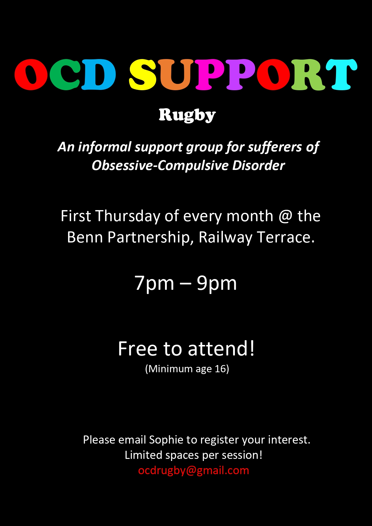 "I have been attending the OCD group in Rugby for just over 15 months after seeing a leaflet on a notice board. The group was very welcoming and it is so useful to have people around you who understand how you feel with no fear of judgement but instead gaining reassurance, recommendations and a listening ears."