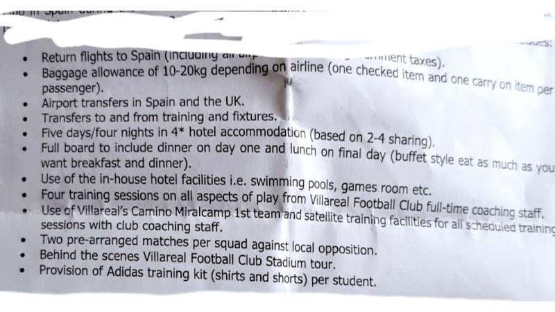This once in a lifetime experience includes...flights, accomadation, 4 training sessions with Villarreal football club, use of Villarreal Camino miralcamp 1st team and satellites training facilities, two pre arranged matches, behind the scenes stadium tour and an Adidas training kit.
