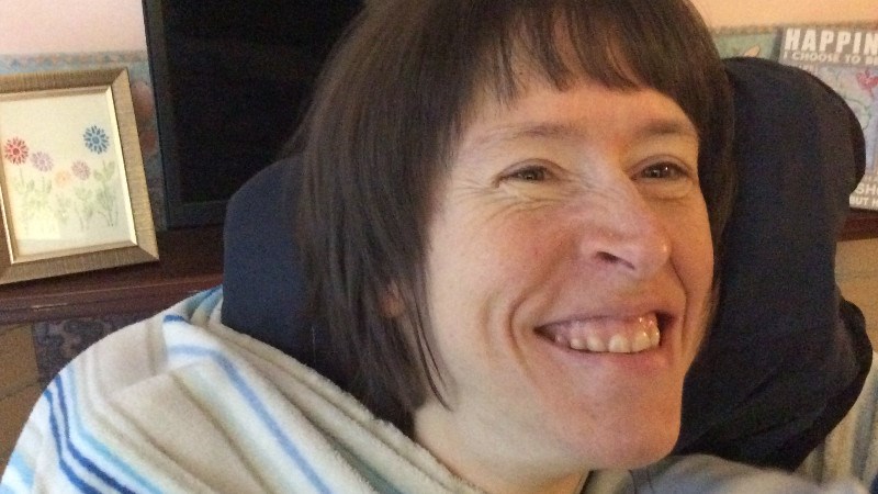 I cannot walk or feed myself but I can do art with my head pointer and I have made a lot of cards with help from my friend and I have an eyegaze computer so that I can write emails with my eyes."