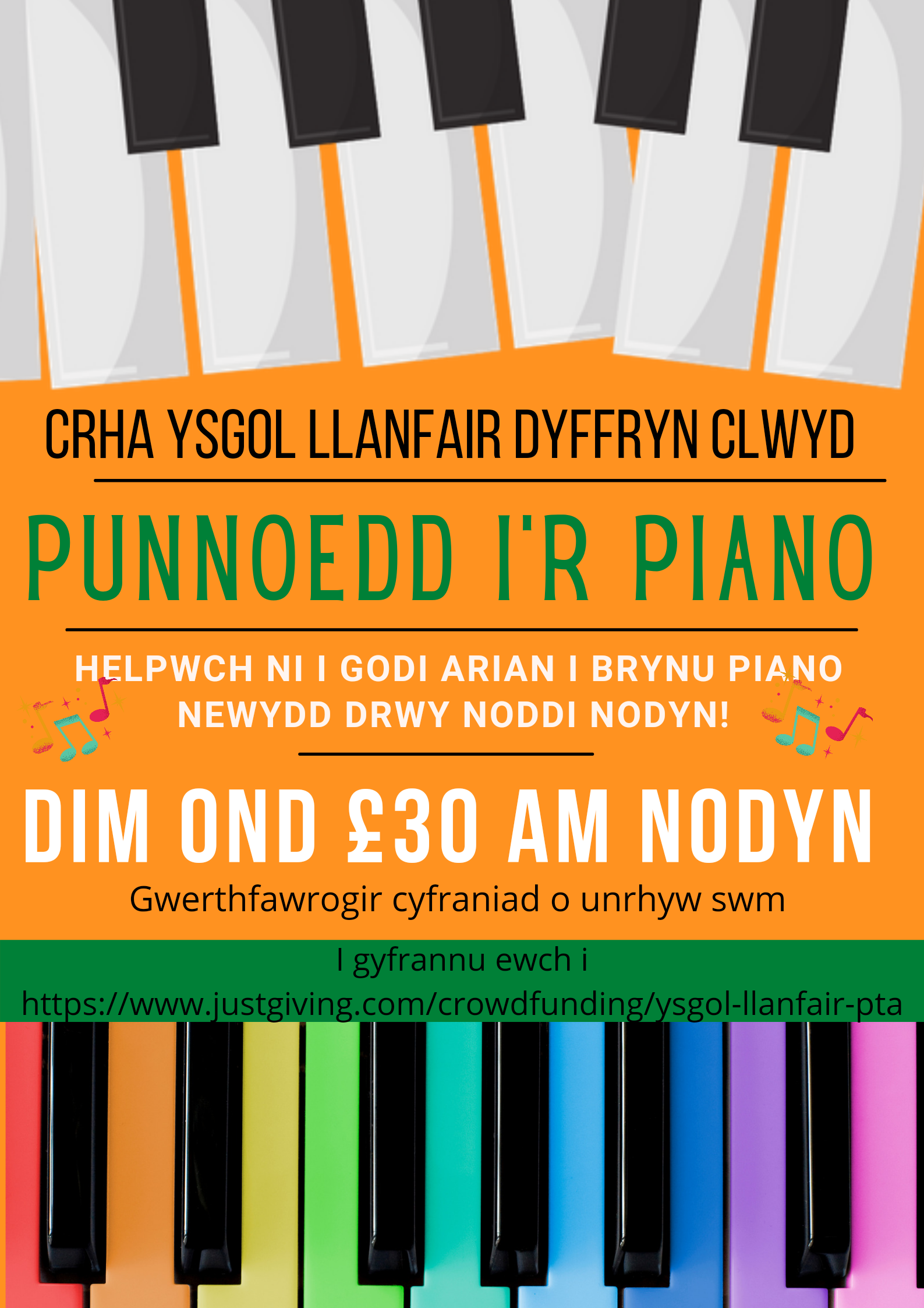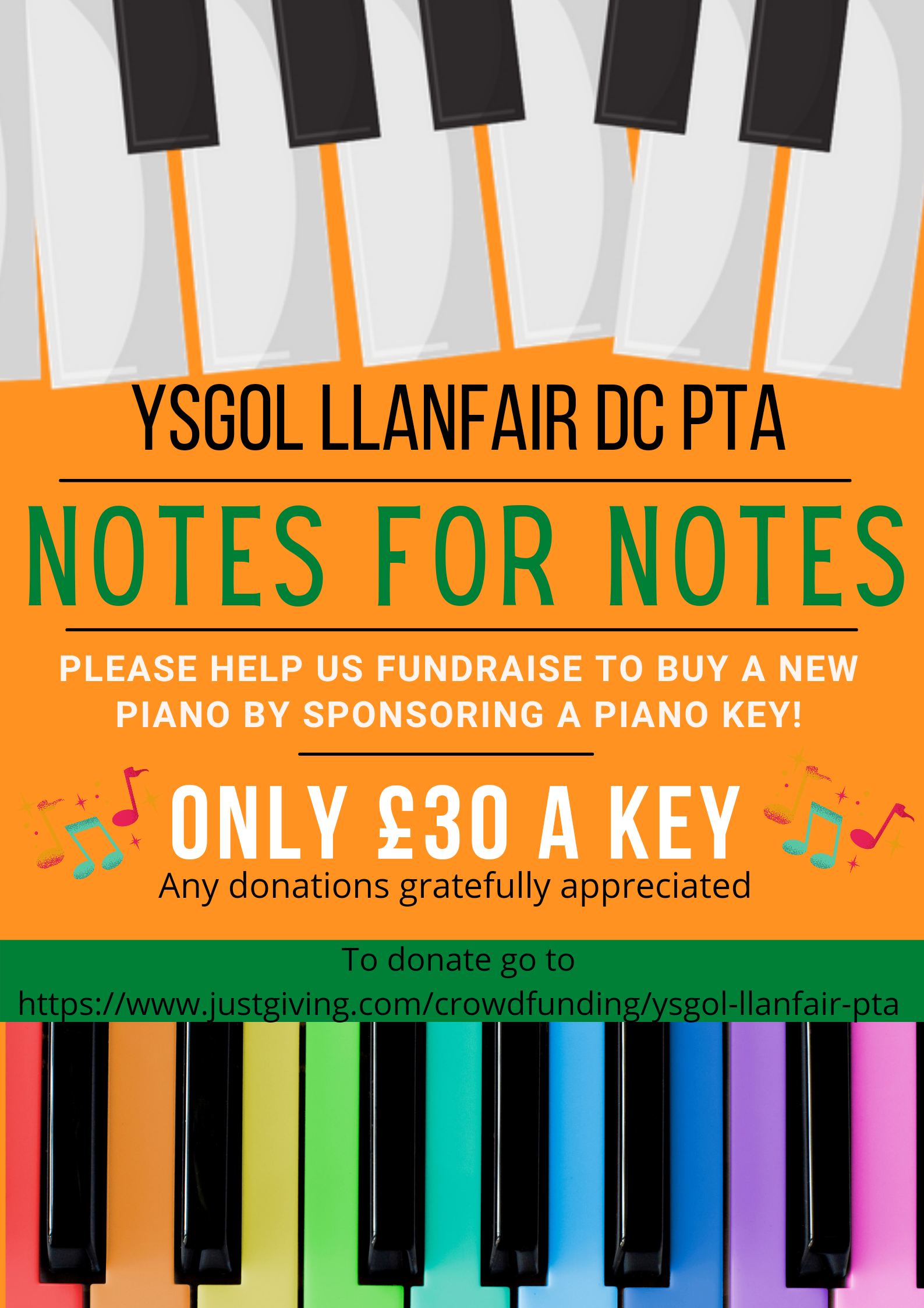 Hello! The children and teachers at Ysgol Llanfair DC use their piano for singing, school plays and they have been busy practising for the Urdd Eisteddfod but the current piano has seen better days! Please, please help us raise the rest of the money required to buy a much-needed piano and cover with our ‘Notes for Notes’ fundraising of £30 per piano key. Donations of any amount will be gratefully received, and you can buy/sponsor as many keys as you would like!