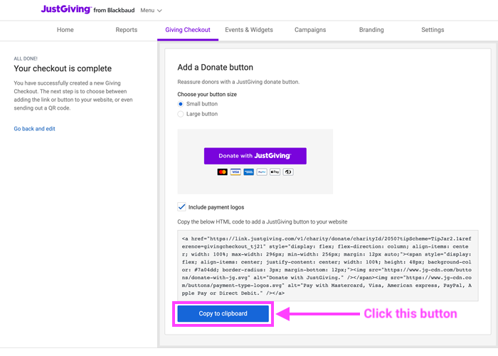 Customise and copy your Giving Checkout Button HTML directly from your setup wizard.