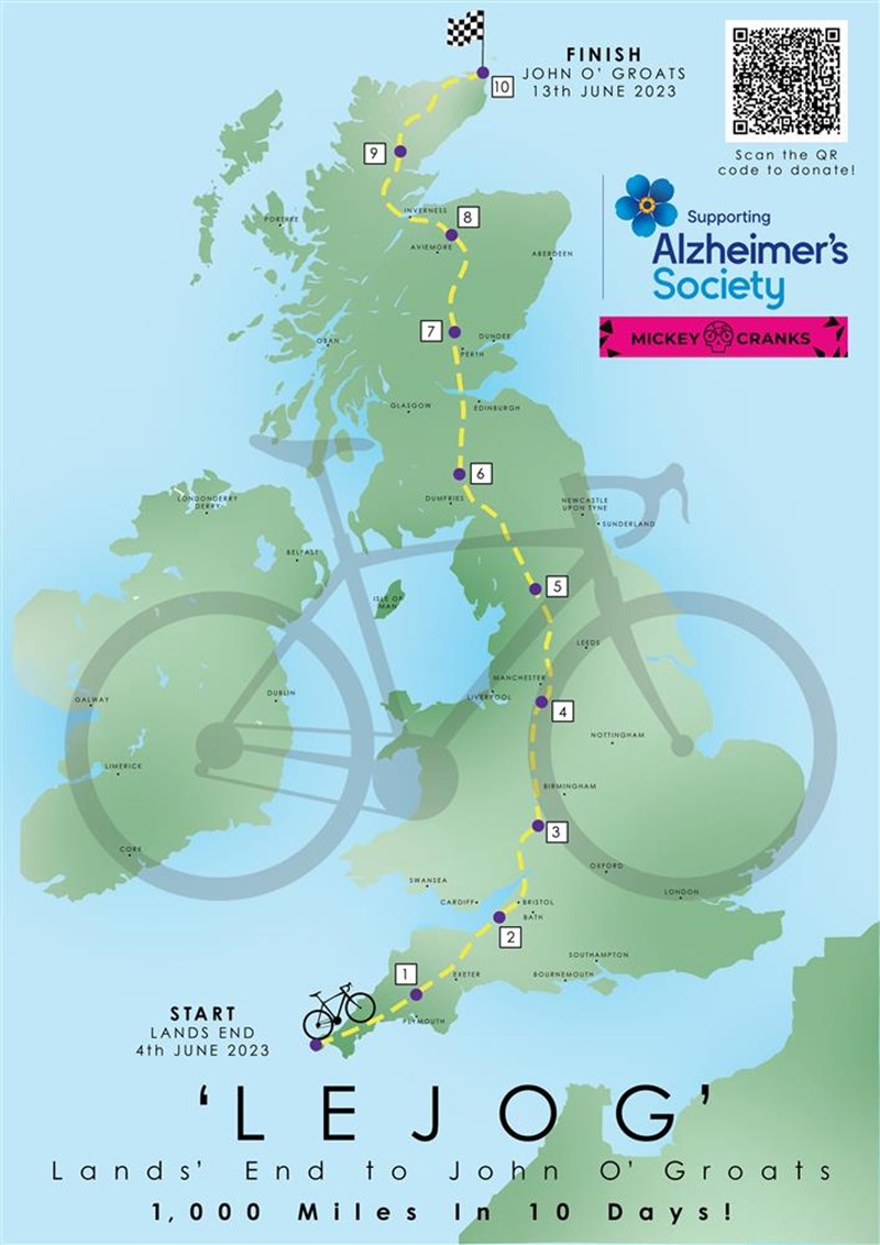 I am riding with nine other cycling friends. Eight of us are members of Mickey Cranks Cycling Club. Although experienced cyclists we know that riding 100 miles for 10 days is a big challenge. Our LEJOG will be between the 4th and 13th June.