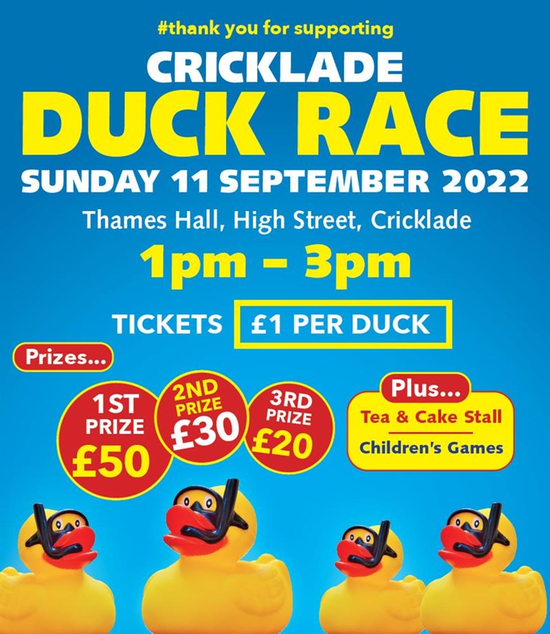 Our Annual Duck Race is on Saturday 23rd September 2023. 1pm to 3pm at the Thames Hall, Cricklade. SN6 6DD.