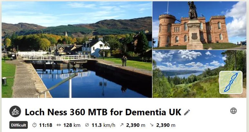 To help raise funds for Dementia UK, my colleague Derek Stuart and I have decided to attempt a circumnavigation of Loch Ness in one day. It's an 80 mile route, so setting the fund raising target at £8000, £100 per mile.