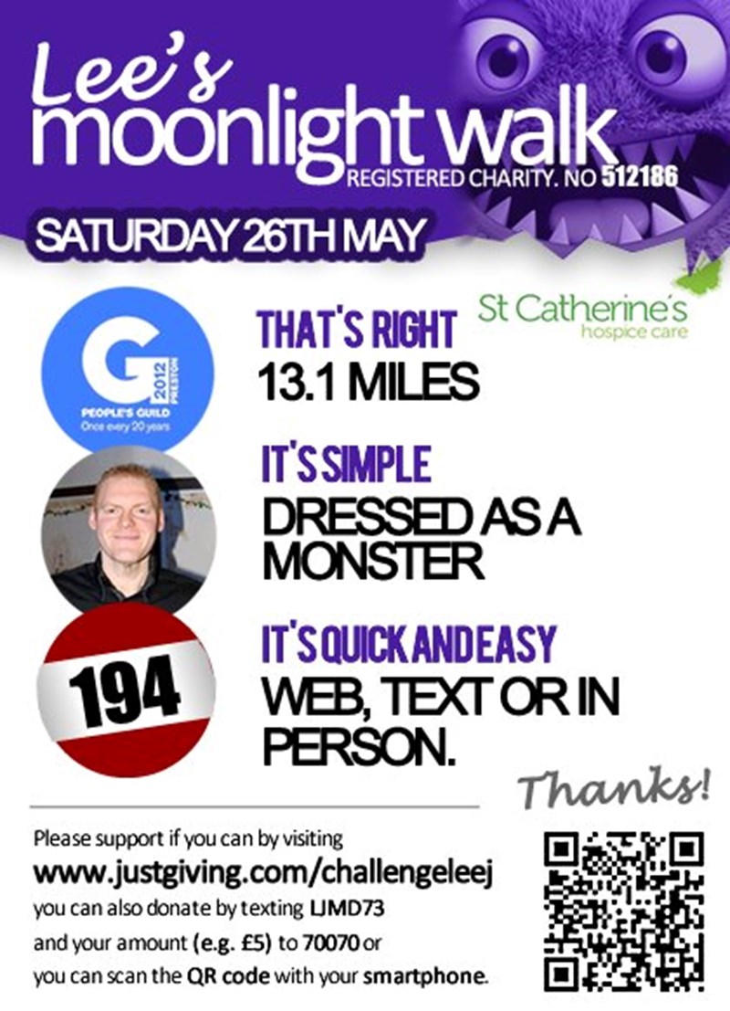 Preston Guild is every 20 years. So for this year only the annual Moonlight Walk is open to men also. I will be completing the full 13.1 miles.