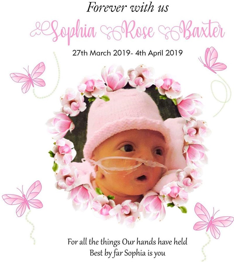Our beautiful daughter Sophia was born on the 27th March 2019 at Preston Hospital. Scans were carried out shortly after which revealed her heart condition was so severe they didn’t think surgery was possible. Sophia was transferred to Alder Hey for further assessment where they confirmed the worst, her condition was inoperable. Our world came crashing down. After various discussions with the staff at Alder Hey and our parents regarding what to do next, we decided to be transferred