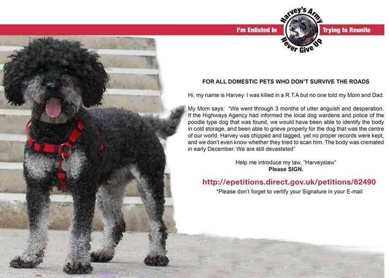 HA procedures state that a description of the dog should be recorded and this should be passed to the local police and dog warden. The HA log says ‘poodle type’ dog. This information was not passed on. We were in regular contact with the police and local dog wardens during the whole search. We were told on the phone by a Highways Agency worker that the body of the poodle type dog they found had been cremated in early December. Although there is plenty of evidence that this must be Harvey, we will never know for certain, and his owner's were never given the chance to identify or reclaim his body.