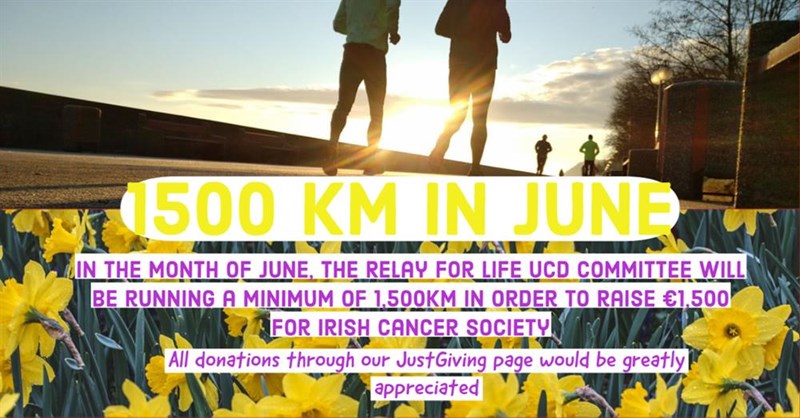 Although our Relay for Life UCD 2020 was cancelled, we are continuing our efforts to raise funds for Irish Cancer Society to make sure that nobody will face cancer alone. Our target was to raise to €10,000 so that Relay for Life UCD would have raised €100,000 for Irish Cancer Society over the last 9 years. We are currently €1500 short of our target and so we have decided to run €1500km collectively between our committee members in June. Your support will mean cancer patients and their loved ones can get free information and support to help them through their diagnosis, as well as fund life-saving cancer research happening right here in Ireland.More people are being diagnosed with cancer today than ever before, but the good news is more people are surviving. Thirty years ago, only 4 out of 10 people survived cancer. Today, thanks to better care, support and treatments, 6 out of 10 will survive. Your support will help us get to 10 out of 10 people surviving.