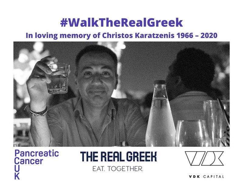 To honour the memory of Christos, who’s loss was devastating to us, we have partnered with Pancreatic Cancer UK and we are continually raising funds through lots of different activities, such as donating 25p for every Pork Skewer meze dish that is ordered in the restaurants. This #WalkTheRealGreek challenge is something we hope to do annually, in partnership with Pancreatic Cancer and with Vasilis Karatzenis (Christos’ brother) company, VDK Capital. (web address: vdk.capital)