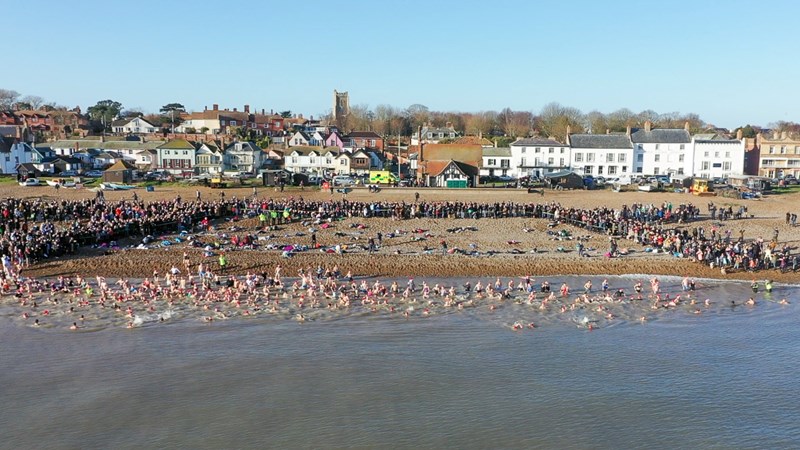 The swim will take place at 11.00am on Tuesday 26 December, on the beach opposite the Moot Hall, Aldeburgh. This is an event for confident swimmers who do not suffer from medical conditions which make cold water swimming unsafe. If you want to join in do please ensure you arrive in good time, at least fifteen minutes before the start time. You’re in the water for a maximum 60 seconds, although on a cold day that can feel like the slowest 60 seconds of the year.