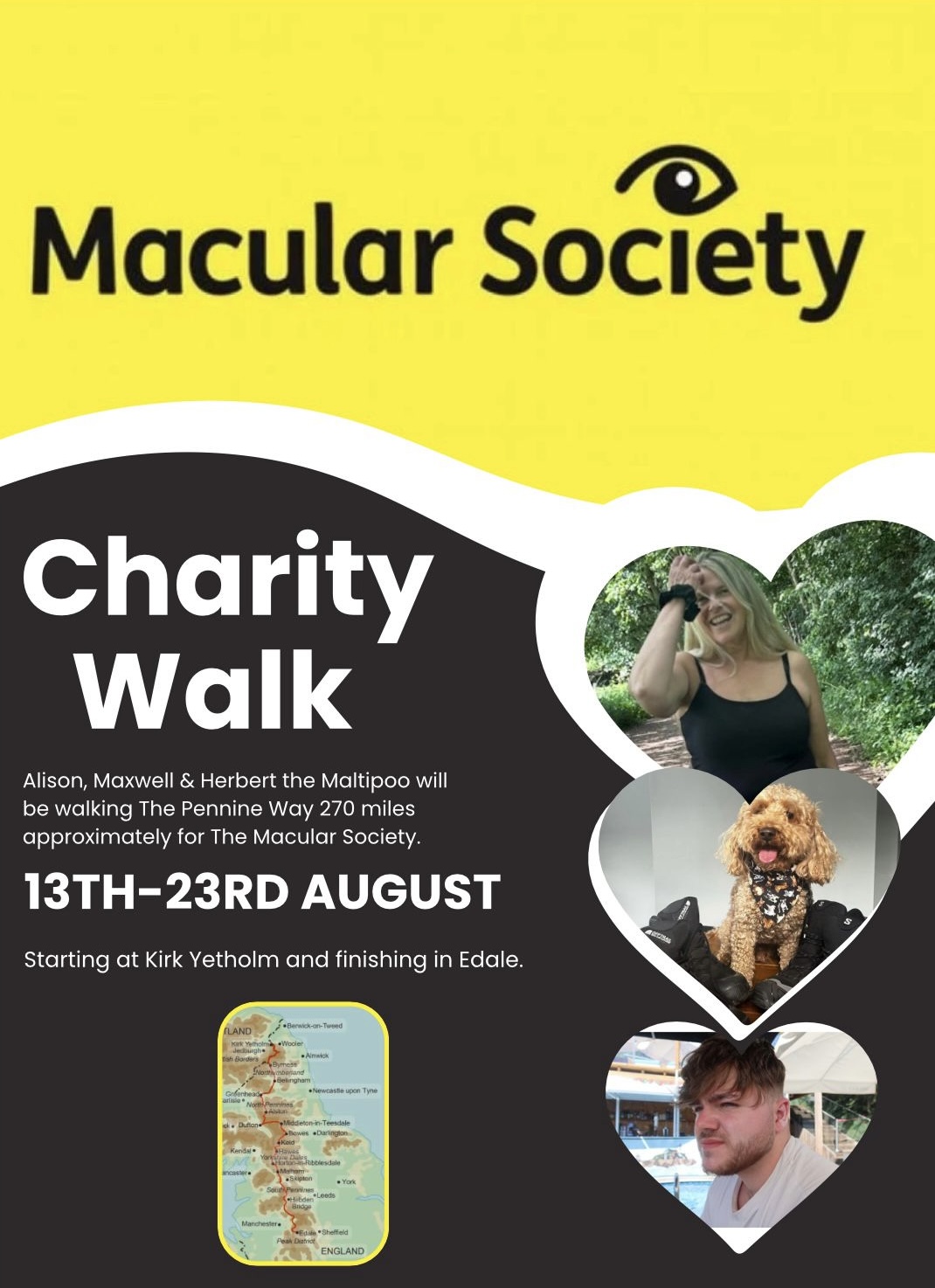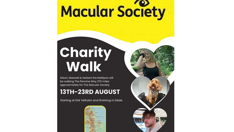 Alison, Maxwell and Herbert will be walking the Pennine way 270 miles approximately for the Macular Society.