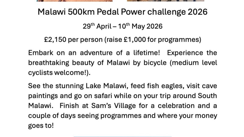 Malawi 500km Pedal Power challenge, April/May 2026, to raise funds for community-based projects that integrate education, enterprise, environment, nutrition and health. Empowering communities out of poverty and towards sustainability.