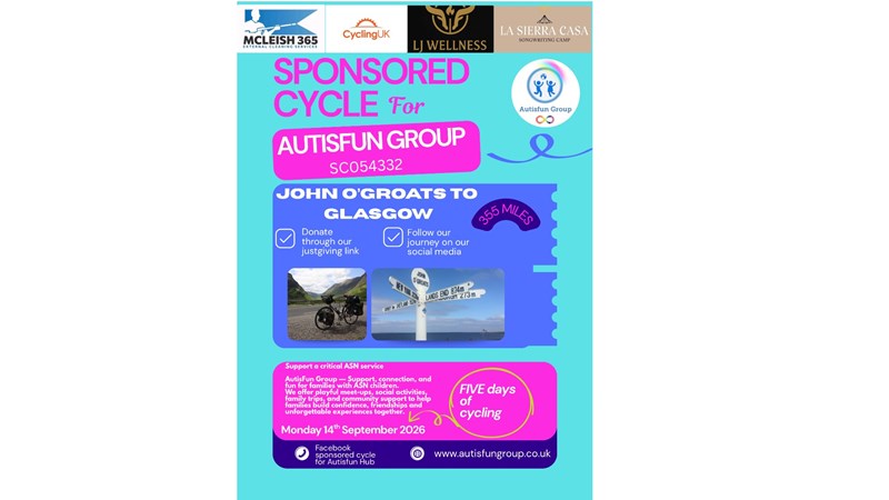 We are taking on an incredible 355-mile cycling challenge from John O’Groats all the way to Glasgow to raise vital funds for AutisFun Group’s new ASN Family Hub.