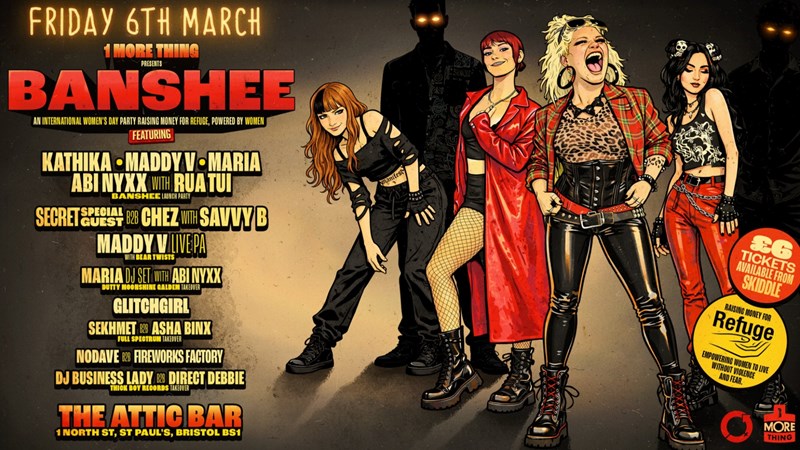 'Bristol get busy! 1 More Thing returns with its first event for 2026: BANSHEE. A night of fierce female energy for International Women’s Day with all profits going to Refuge charity.