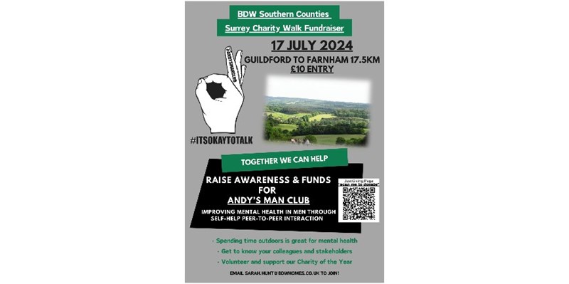 A group of us will be walking from Guildford to Farnham (stage 1 of the North Downs Way) approximately 17.5km in aid of our Charity of the Year, Andy's Man Club.