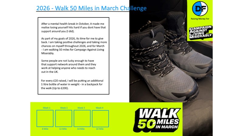 Now, for 2026 - I am taking some positive steps and pushing to try new things and old things. In March, I am going to be taking on "Walk 50 Miles in March for Campaign Against Living Miserably." I'm raising money to support their lifesaving services, and your contribution will help them reach more people.