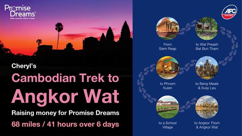 I’m Cheryl Harvey and in November, I’ll be taking on my biggest challenge yet - trekking 68 miles across Cambodia to Angkor Wat to raise £5,000 for Promise Dreams, a charity dedicated to bringing joy to seriously and terminally ill children. Whether it’s a once-in-a-lifetime holiday, meeting their hero, or receiving essential specialist equipment, Promise Dreams creates precious memories for children and their families during unimaginably difficult times.
